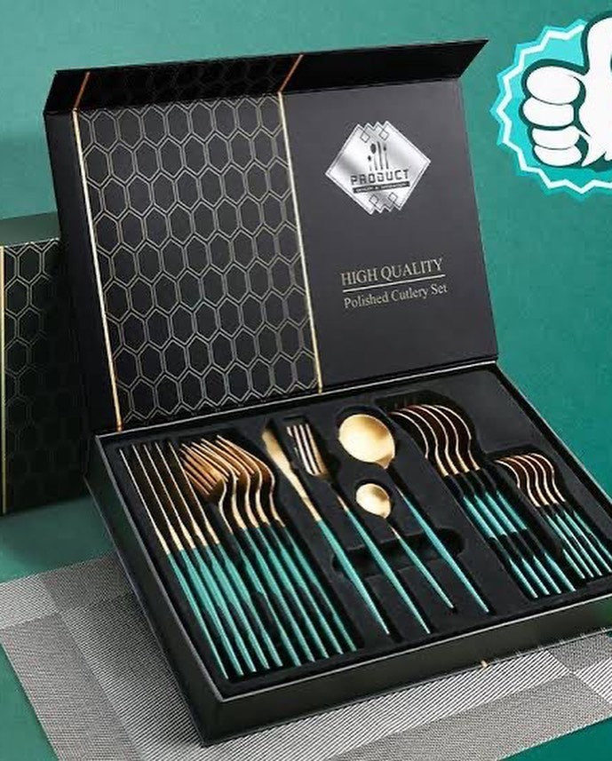 24 PCs Premium Steel Cutlery Set-Green over Golden