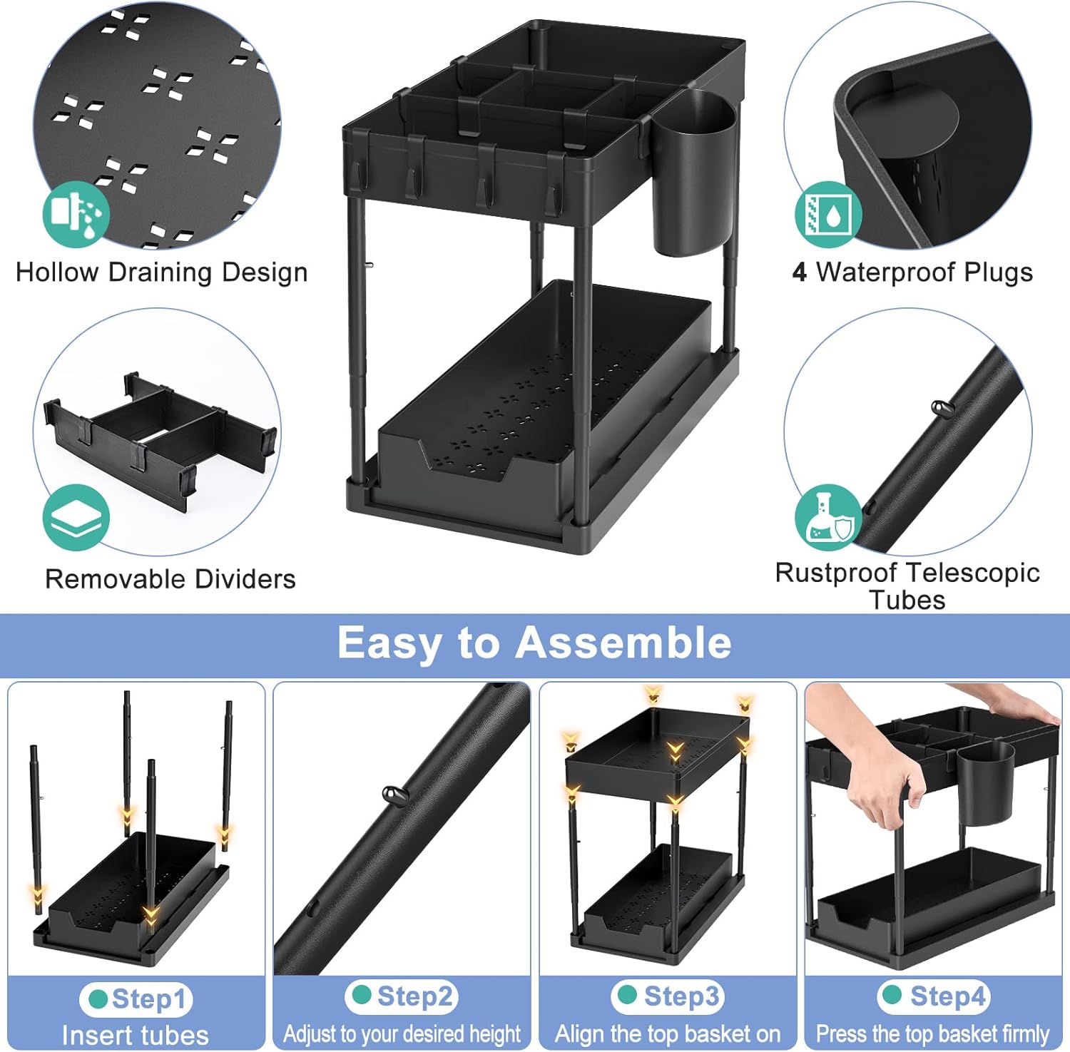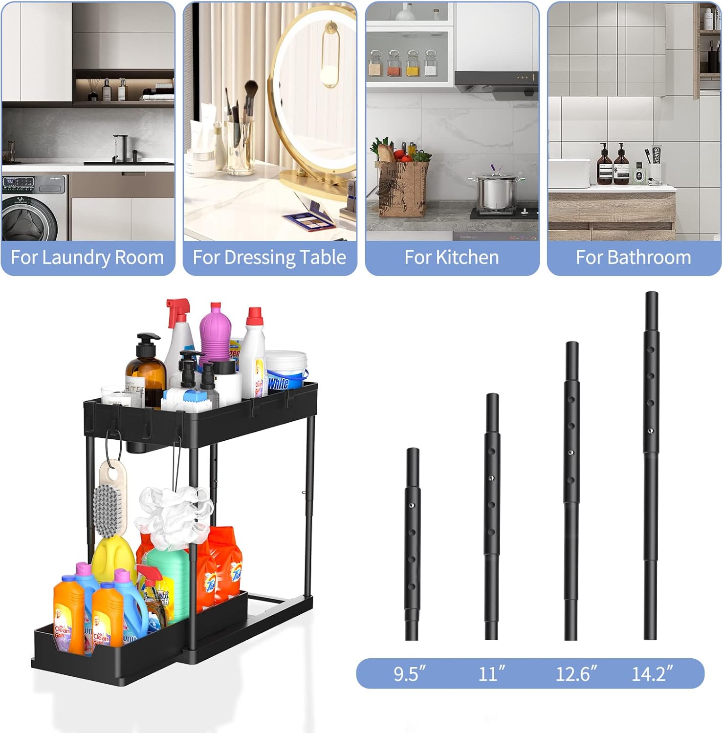 which is suitable for most under sink cabinets, effectively using the space under the sink to store cleaning supplies, making your items well organized and stored in an orderly manner. Say goodbye to the cluttered space.