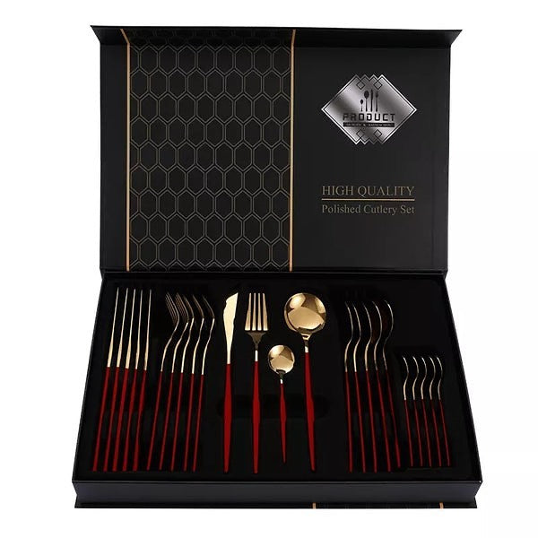 24 PCs Premium Steel Cutlery Set-Red over Golden