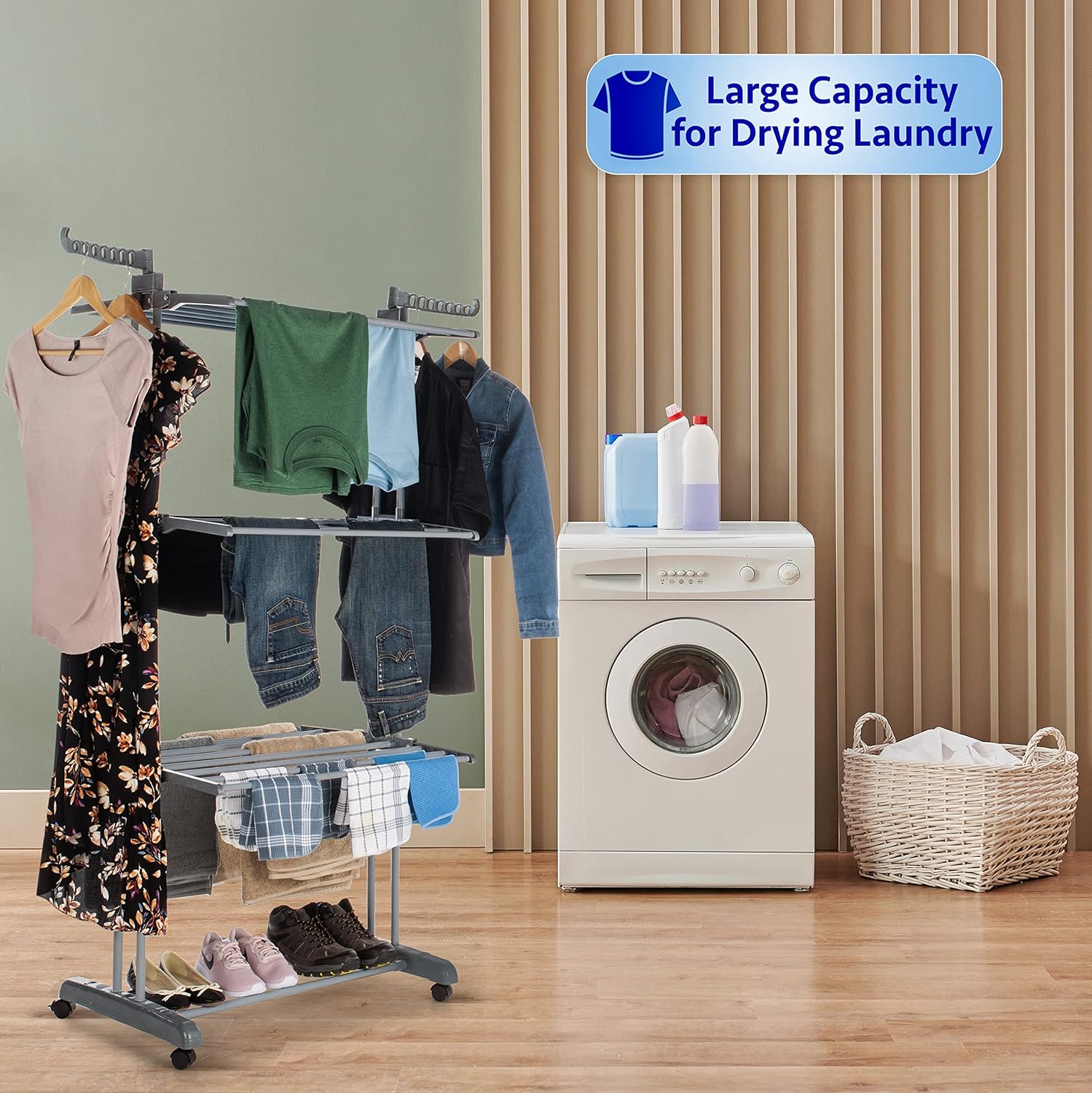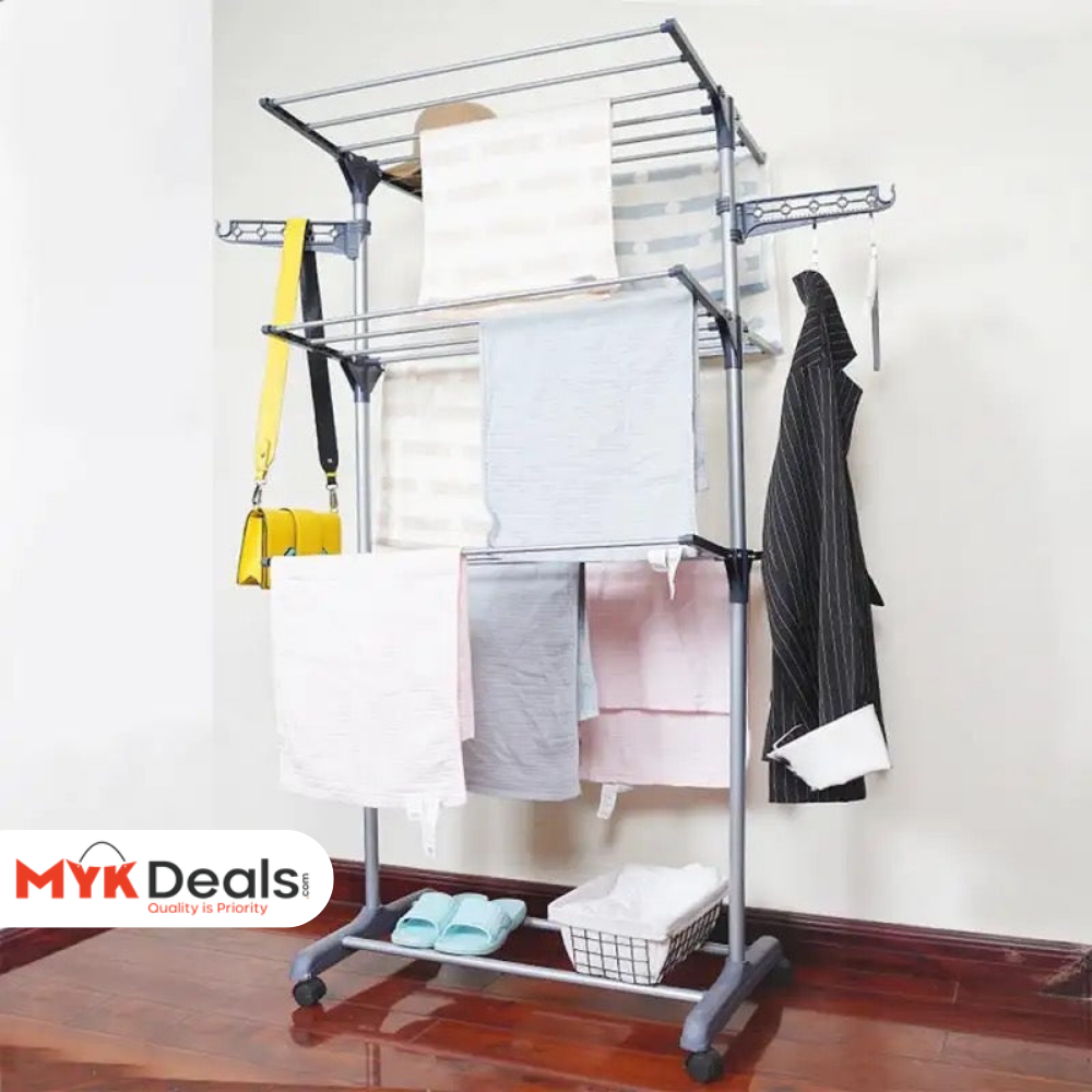 This hanging rack is everything you need from drying your laundry to storing your clothes and other wearables. It is constructed from a high quality durable and sturdy steel, powder-coated to protect from rust and corrosion. It can handle and organize your clothes. Base and contraption are high grades ABS plastic that provides a durable linkage of metal and creates its sturdy structure. It's consists of 6 foldable & collapsible shelves and expands air-drying space requirements. The base is supported by 2 powder-coated solid steel base bars for better support, increases stability and can accommodate shoes for drying or keeping. Both upper sides have a functional 2 wing hanger slot to position clothes with an ample amount of space between to maximize drying or just to organize clothes neatly. It also has an easy to move wheel design consisted of a lockable rolling caster to secure the load and can be optionally placed from outdoor to indoor. Lightweight and conveniently easy to fold for storage and not to take too much space. It is easy to assemble This moving clothes rack, It is versatile that this can be used as a drying station or a clothes organizer and open wardrobe.