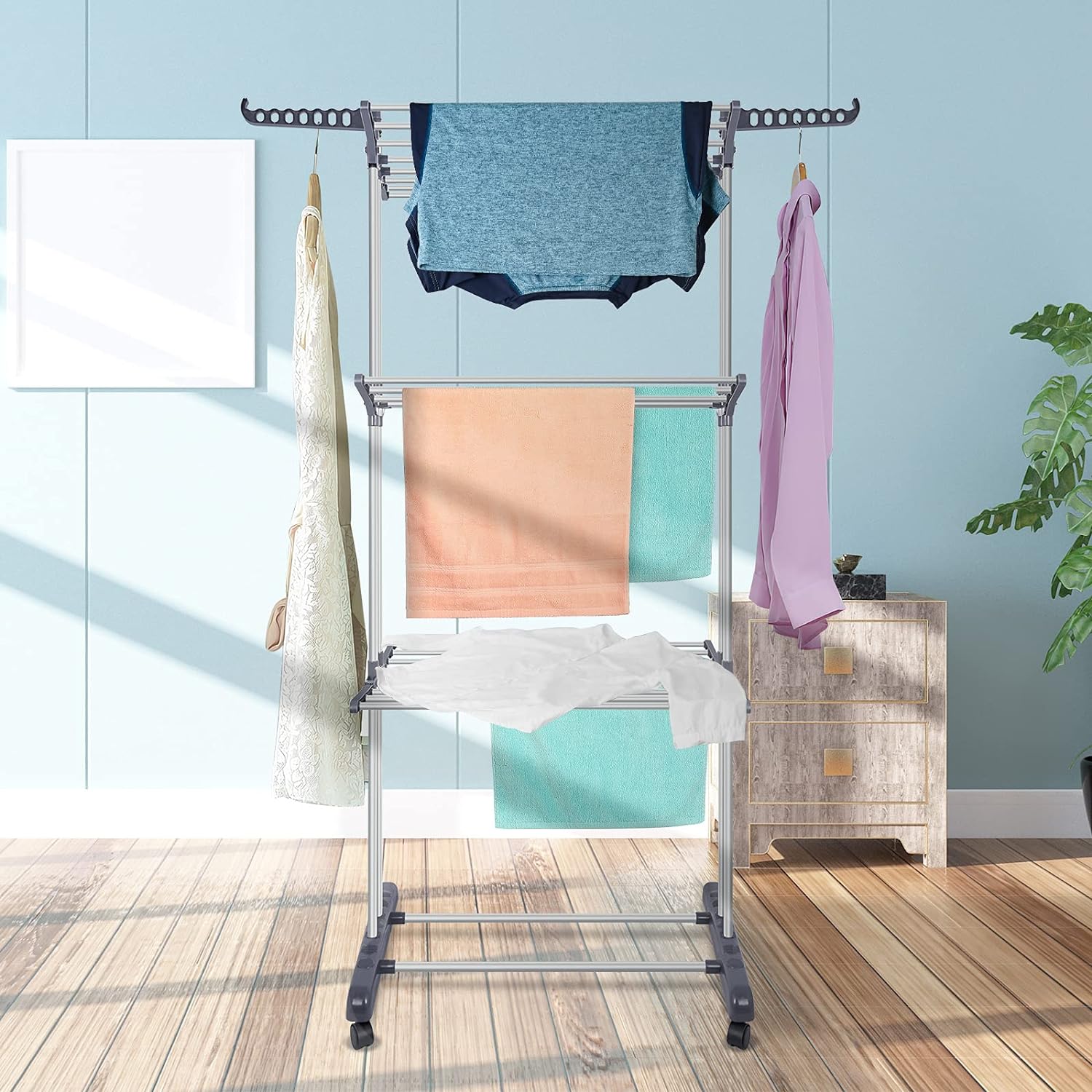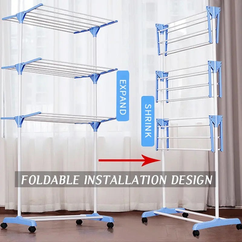 3 Layer Foldable Wing Drying Rack, Double Pole Movable Clothes Rack, Floor Mobile Folding Clothes Rack, Simple Home Cloth Drying Holder, Telescopic Household Laundry Rack, Stacked Wing Drying Rack