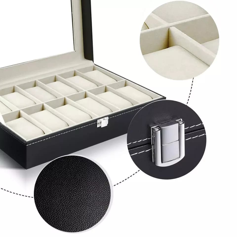 - Made of high grade PU leather material, which is durable, practical and eco-friendly.2.12 Slots for classifying and displaying your watches in order.3.Transparent glass cover is dust-proof and moist-proof, which provides protection for your watches or jewelleries.