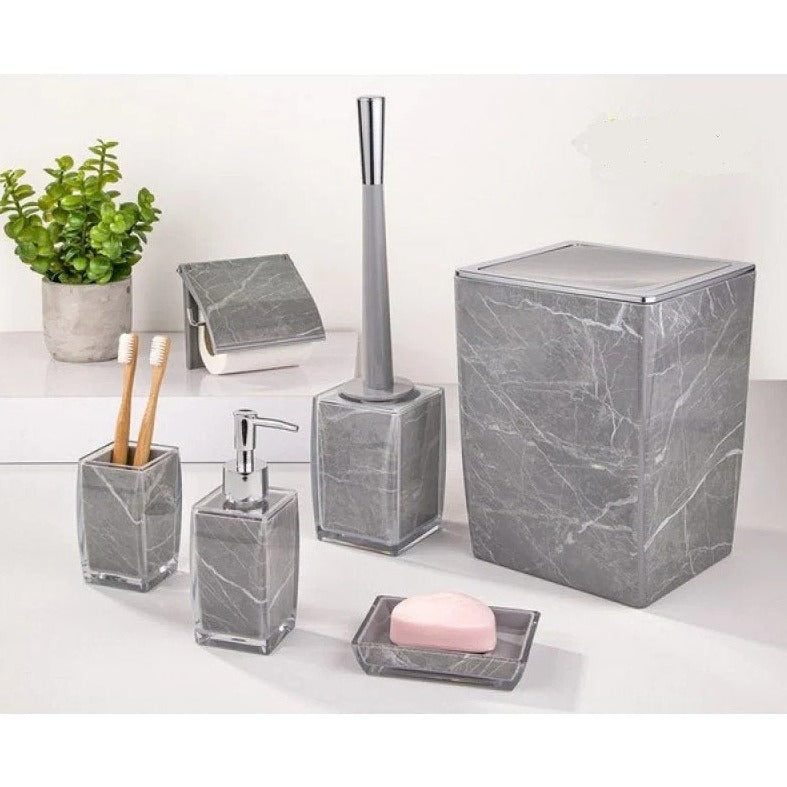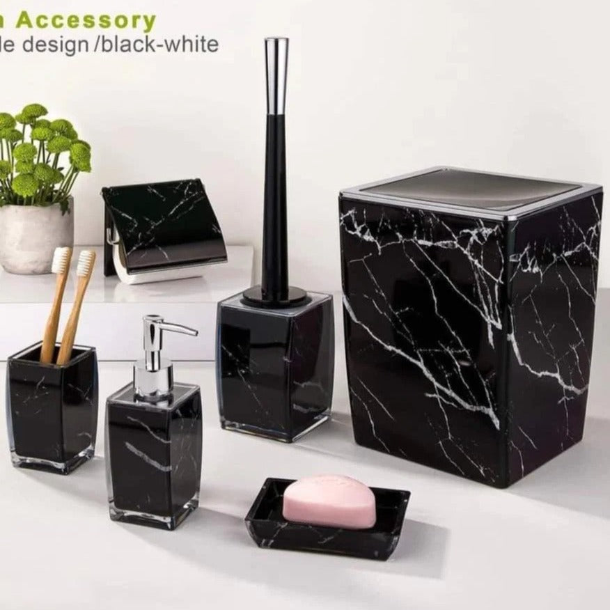 Transform your bathroom with the 6 Pcs Classic Marble Design Bathroom Set. Its sleek black and grey marble finish adds a touch of elegance while ensuring practicality for everyday use.