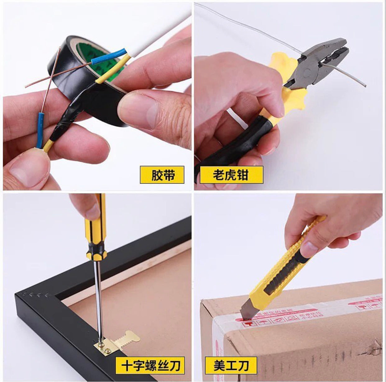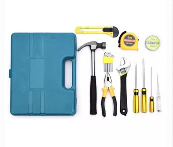 Features Set of 9: Mainly applied to car repairing and household routine maintenance. Can handle most home maintenance needs.1 x 2m measuring tape- 1 x utility knife- 1 screwdriver- 1 x digital test pencil- 1 x cross screwdriver- 1 x pliers- 1 x hammer- 1 x insulating tape- 1 x box.