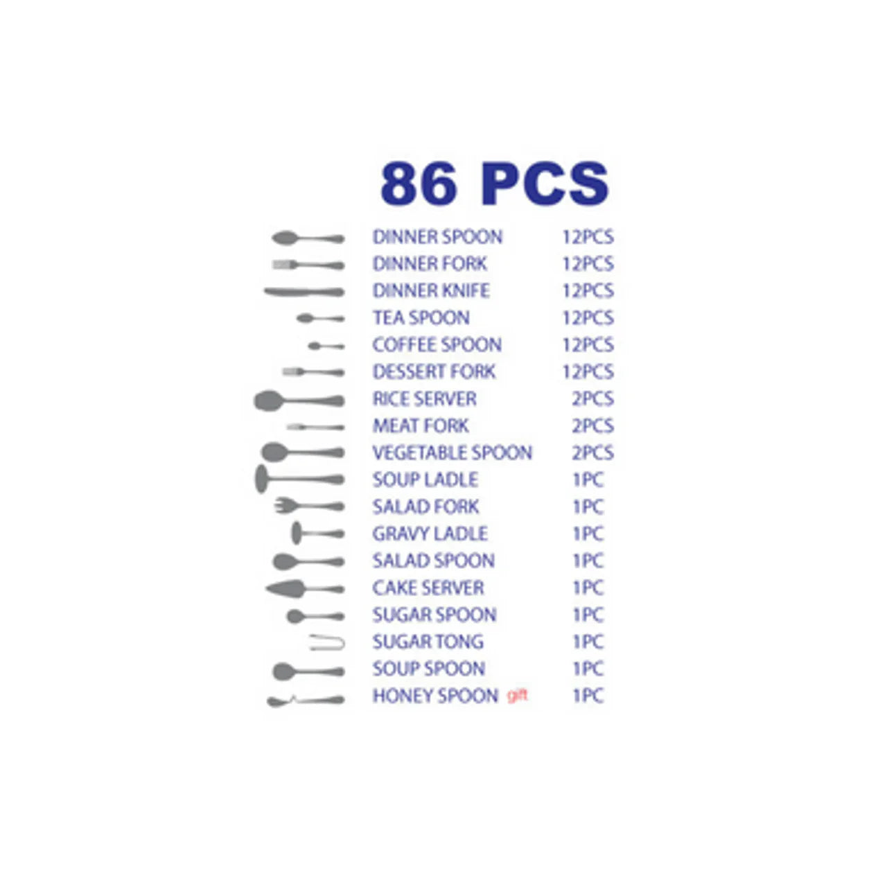 - Set Composition: 12 dinner forks, 12 dinner knives, 12 dinner spoons, 12 salad forks, 12 teaspoons, 12 coffee spoons, 12 dessert forks, 2 rice servers, 2 meat forks, 2 vegetable spoons, 1 soup ladle, 1 salad fork, 1 gravy ladle, 1 salad spoon, 1 cake server, 1 sugar spoon, 1 sugar tong, 1 soup spoon, 1 honey spoon.