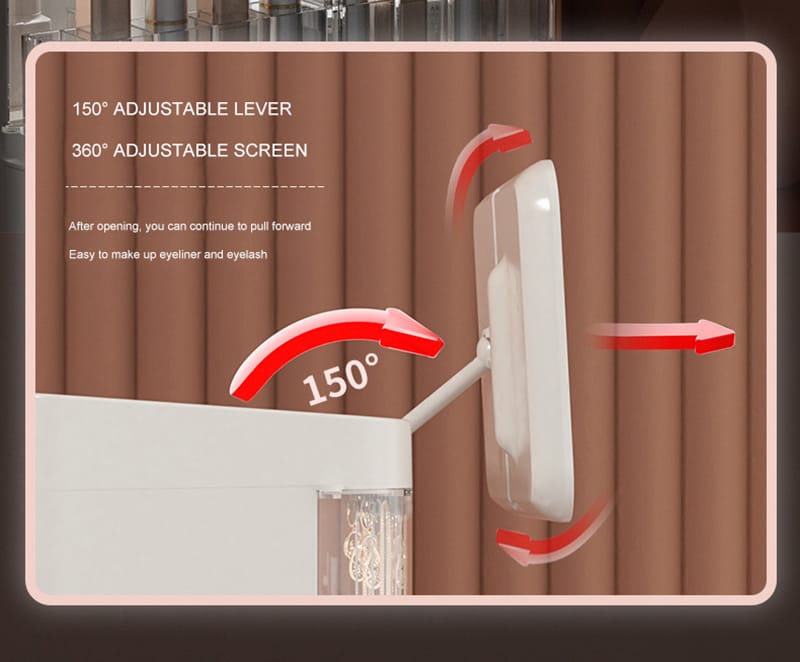 - Built-in mirror with adjustable LED lighting for precise makeup application.