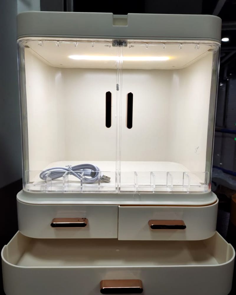 The Classy Cosmetic Organizer with LED Mirror is a sophisticated and practical solution for organizing and displaying your makeup essentials. This stylish organizer combines functionality with elegance, providing a convenient space to keep your beauty products while featuring an integrated LED mirror for added convenience.