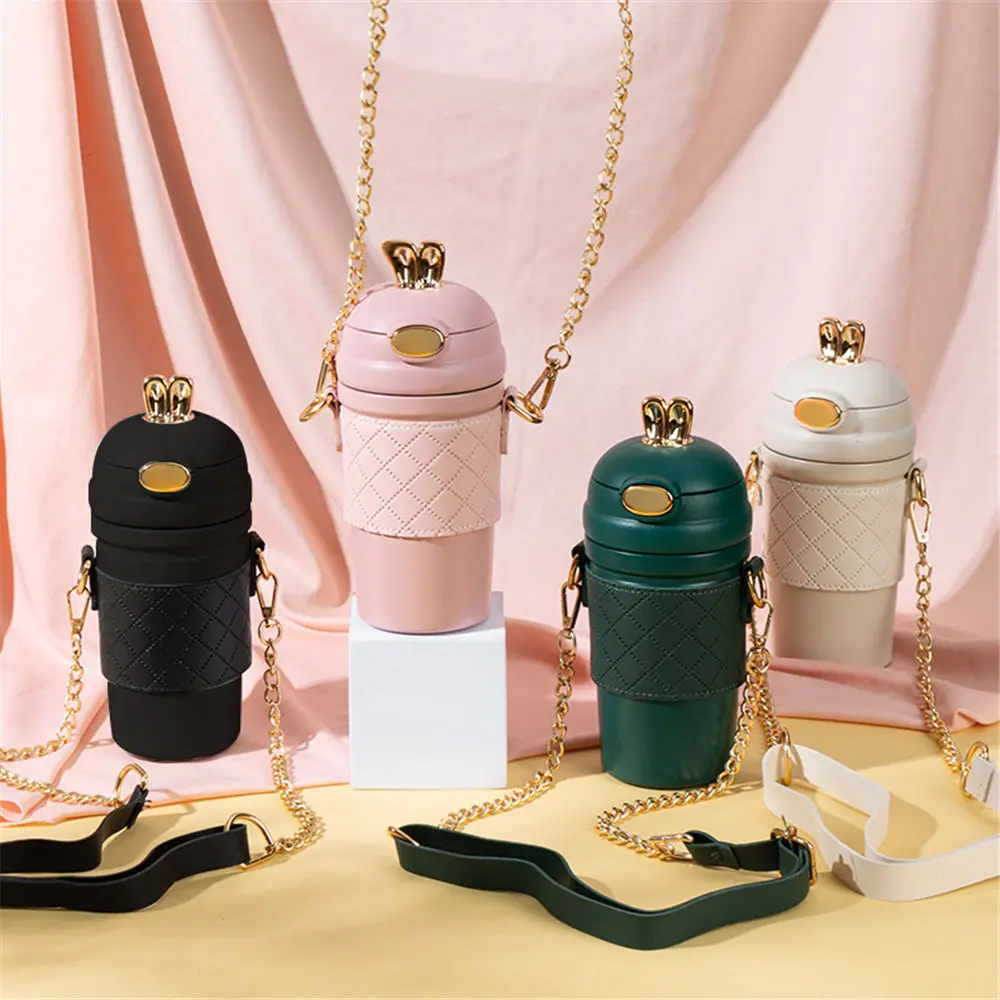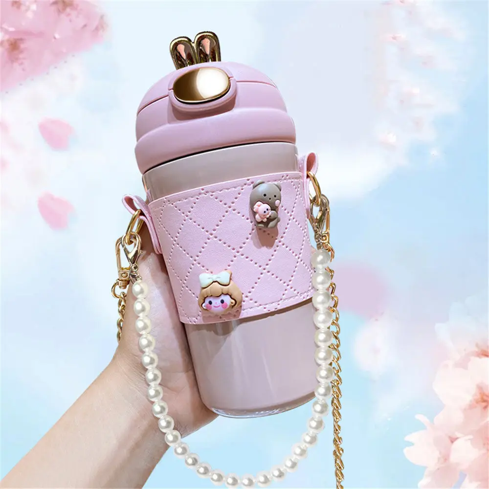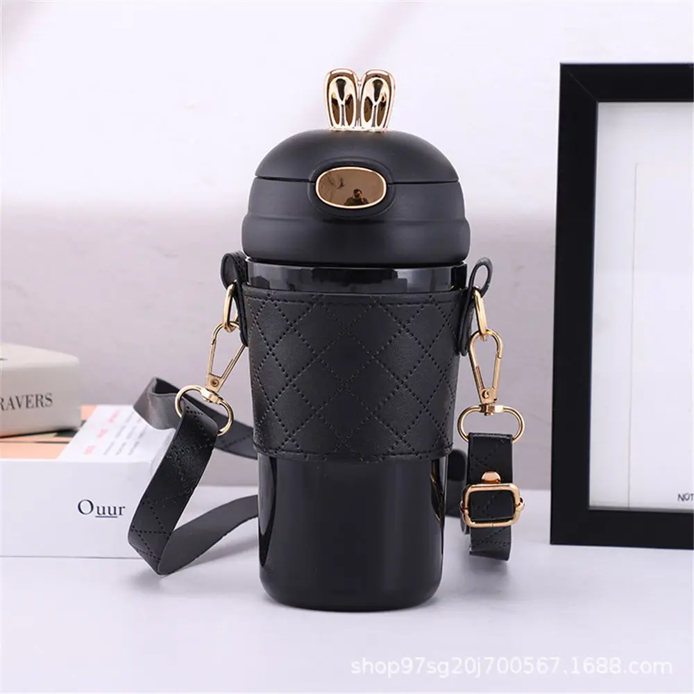 Cute Rabbit Ear Water Bottle 420ml with Straw for Girl Fashion Summer Student Portable Thermose Coffee Tea Cup for Student Kids