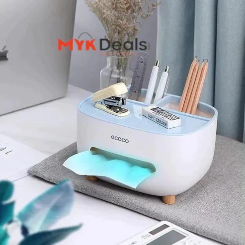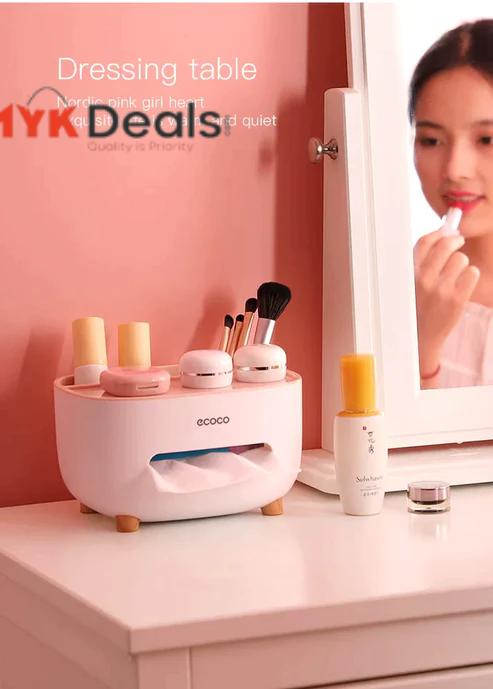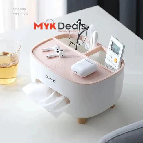 - STYLISH & NEW DESIGN: Tissue box holder with storage caddy helps disguise the boring look of an ordinary square tissue box. Not only for tissue but also can store small sundries at home, such as pen/pencil, smart phone, remote control, cosmetics, brushes, lipsticks and stationeries or other small supplies etc., your desk neater and organized, it's a perfect little container that keeps all things organized.