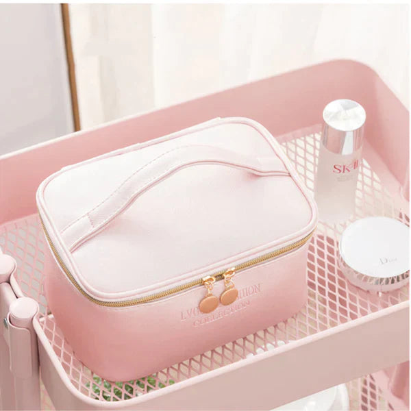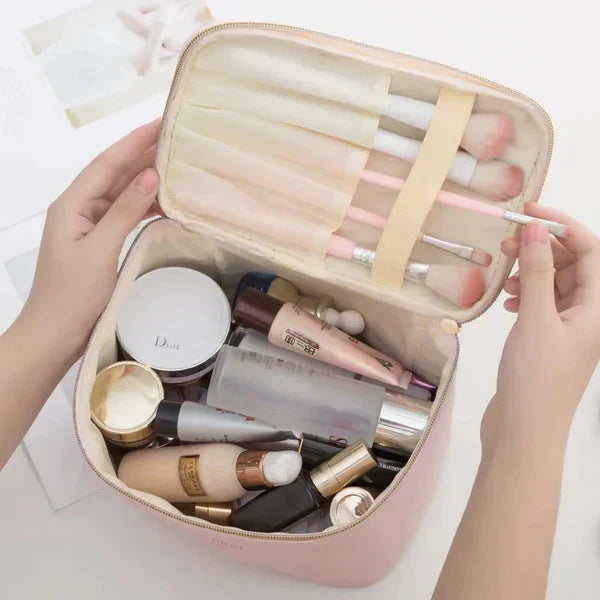 The main large pocket can hold large and heavy toiletries. There is a small pocket on the side of the main large pocket for storing flat items. There is a small Zipper pocket in front of the main large pocket for small items. in addition, there are straps inside the main big pocket that can be used to fix toiletries.