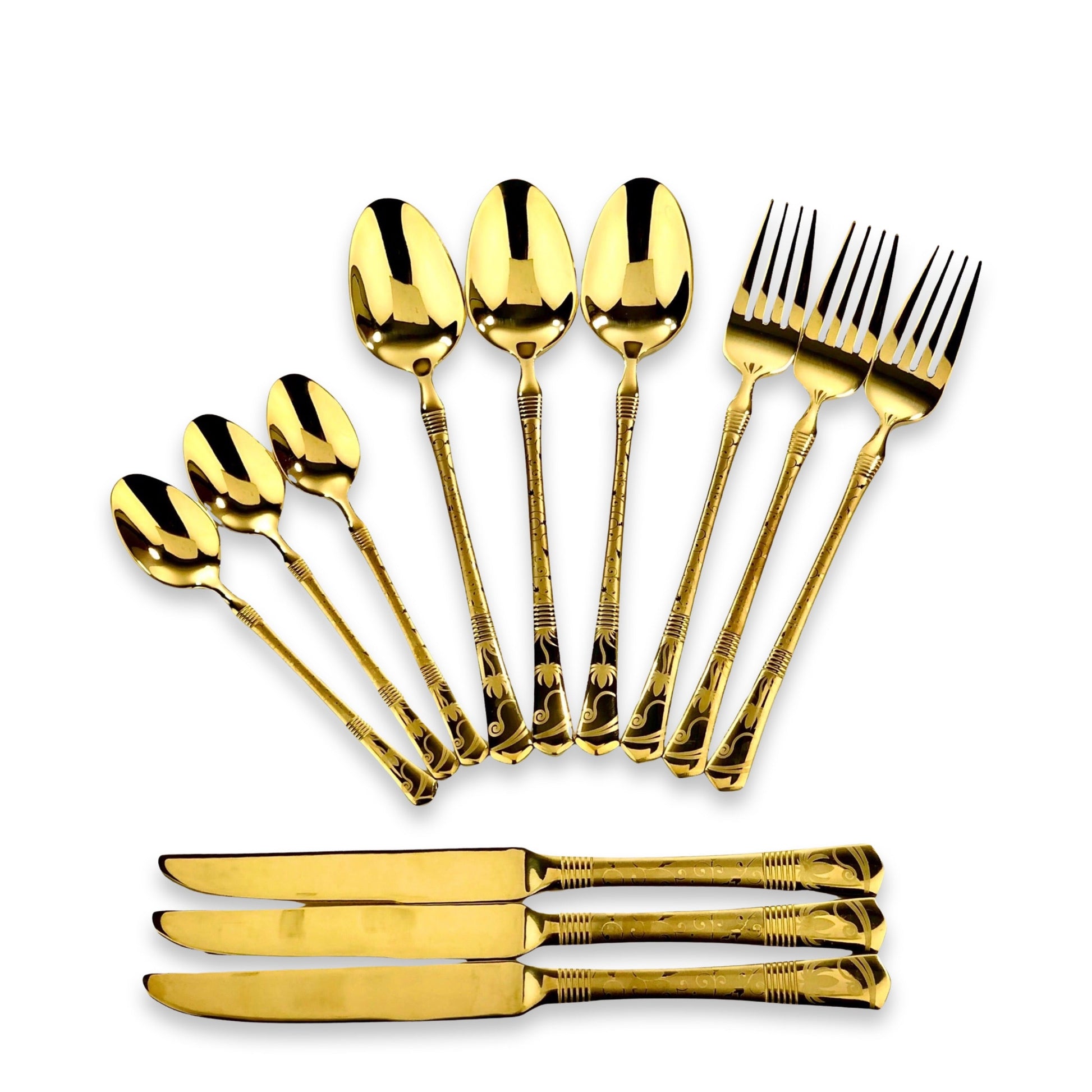 A unique 24 piece cutlery set including 6 dinner knives, 6 dinner forks, 6 dinner spoons, and 6 teaspoons. This set is made of high-quality stainless steel and features a fine mirror polish. The forks, knives, and spoons are heat and rust-resistant. They are comfortable to hold and durable for everyday use.
