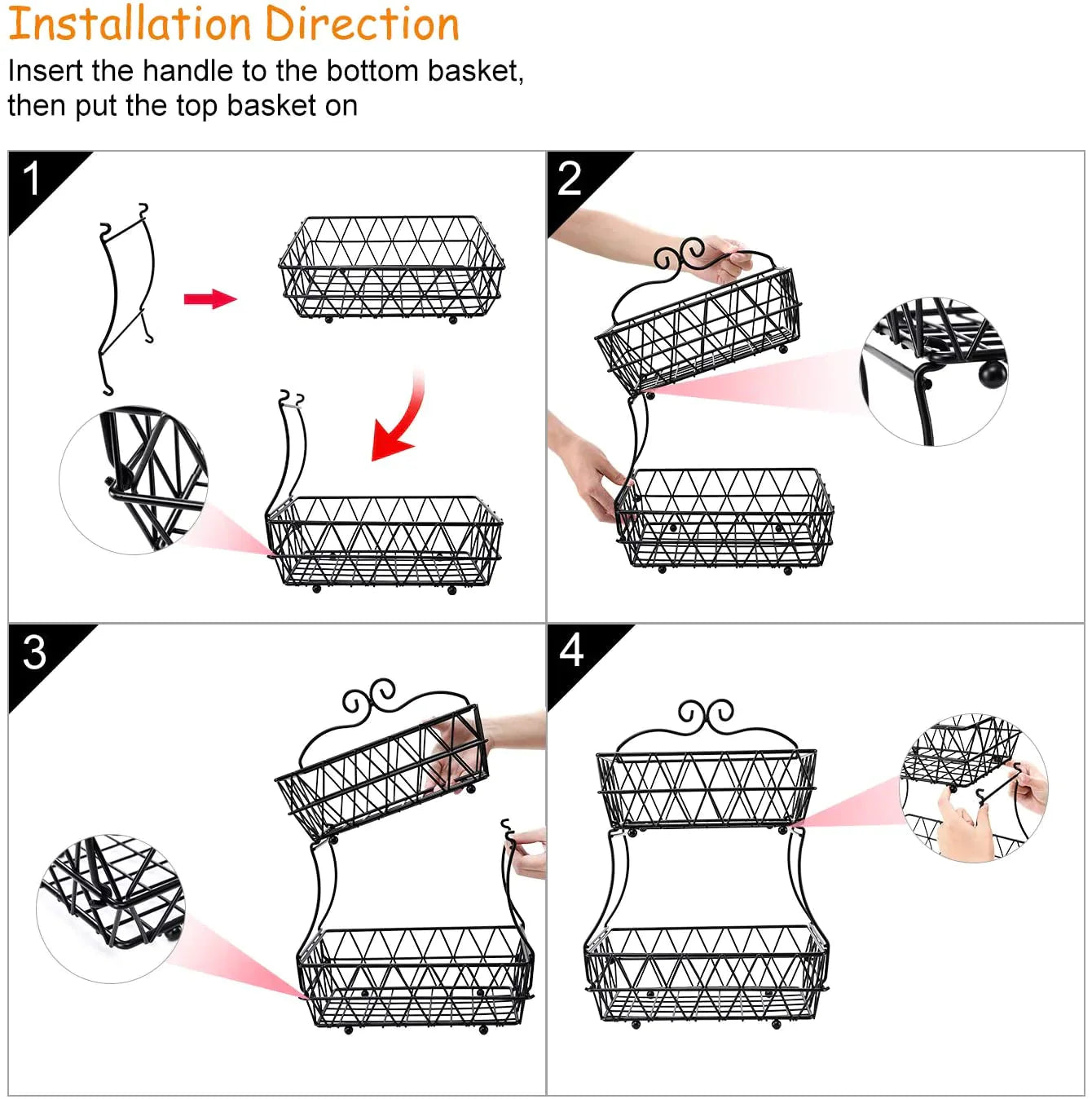 This 2 tier metal basket have a flat back, prevent your food from falling, each basket bottom has 4 small globular mat to support the metal basket stand prevent your food touching the dirty desk. It is ideal to store fruits, products, vegetables, bread, bagels, cupcakes, cakes, snacks, gourmet commodities, etc. It has charming old style for modern and traditional spaces. Flat back design of two levels. Made of metal wire with powder-coated black finish. It perfect storage solution for kitchen, bathroom, pantry, supply room, etc. It is great support for fruit vegetables for dining, buffet, restaurant, indoor and outdoor events, holidays, special occasions.