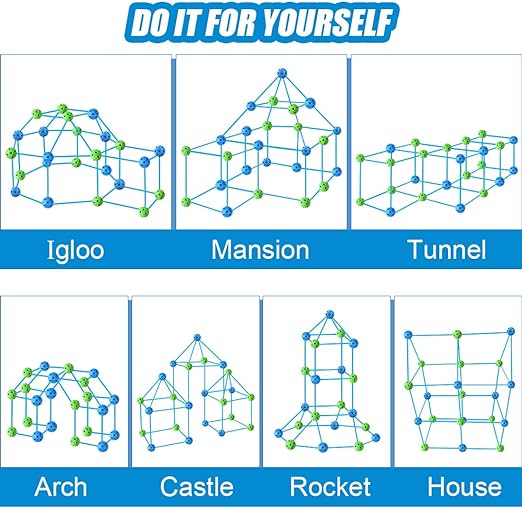 Our build-and-play fort or tent set is an innovative toy that sparks creativity in kids. With easy-to-use connectors, children can construct various structures like caves, castles, tunnels, and tents. Simply add a cover sheet for cozy hideaways. Promotes imaginative play and endless fun.