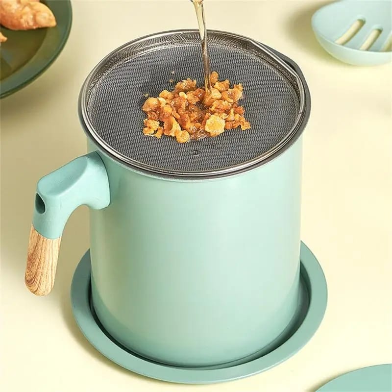 Wooden Handle Oil Strainer, 1.4L Stainless Steel Oil Filter Pot with Tray,